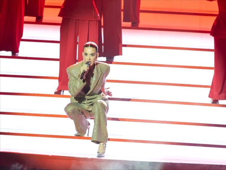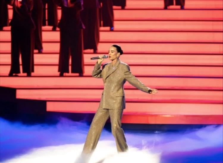 كاتي ببدلة ذهبية محتشمة على المسرح