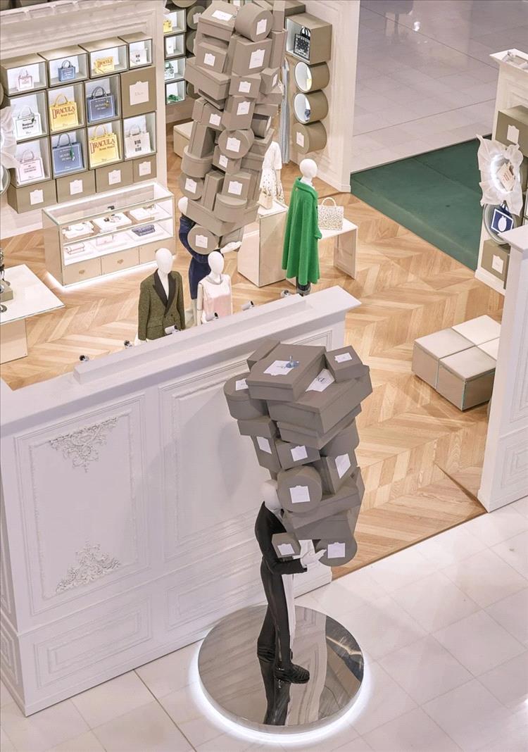 وتكريماً للّون الرمادي المميّز لعنوان "30 مونتان"، وللعلب الثمينة التي تحتضن أرشيف الدار، تتصدّر هذه التركيبات مساحة المتجر المركزية. تتكدّس الصناديق بارتفاعات لافتة، فتنساب من على الرفوف أو تنتظم في أبراج مائلة، تحملها شخصيّات بهيئة عمّال فنادق بروح مرحة، في مشهد يتحدى قوانين الجاذبية.
