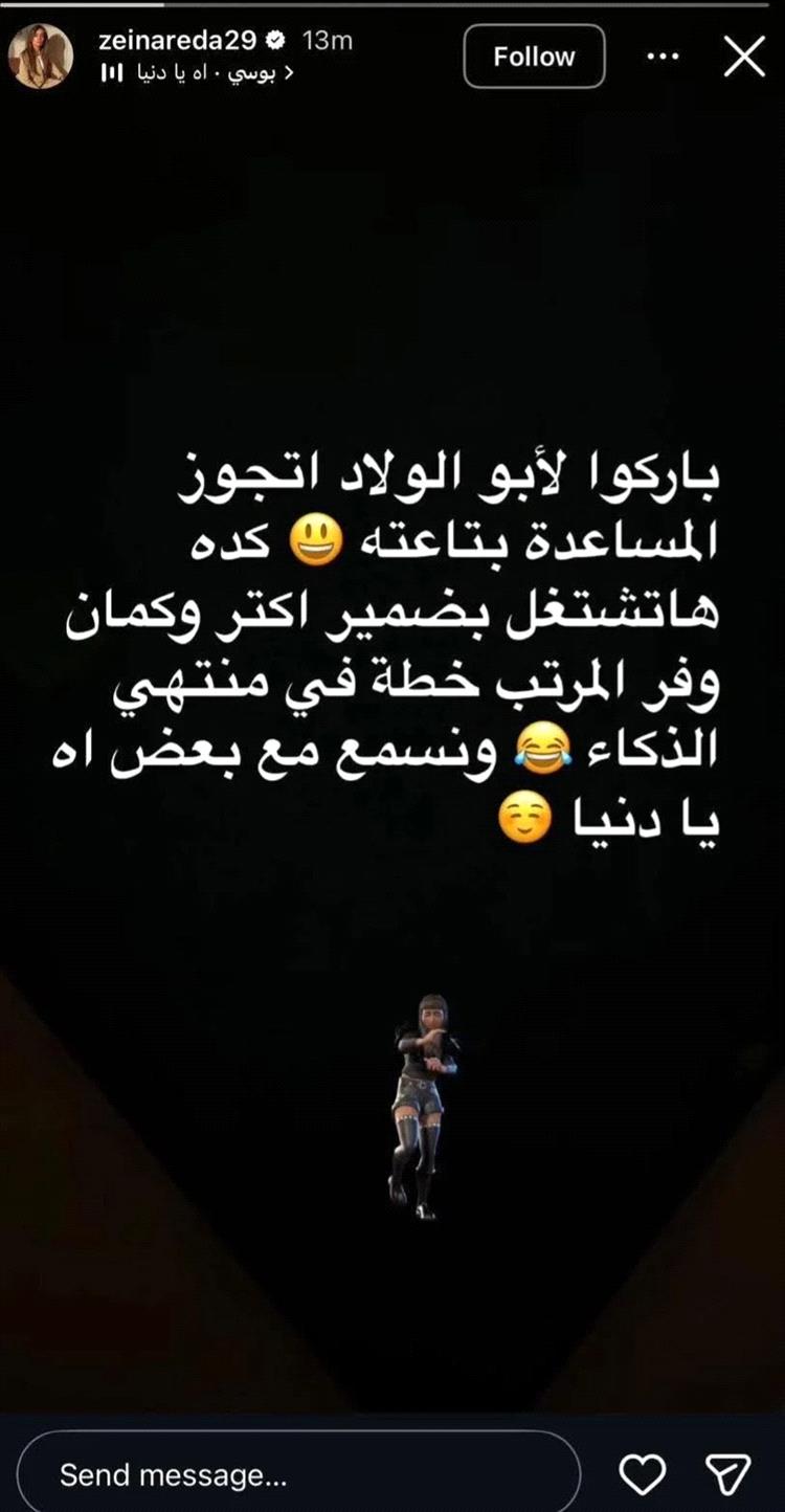 وقالت زينة في منشورها ساخرةً: "باركوا لأبو الولاد اتجوز المساعدة بتاعته. كده هاتشتغل بضمير أكتر وكمان وفّر المرتب... خطة في منتهى الذكاء ونسمع مع بعض آه يا دنيا".