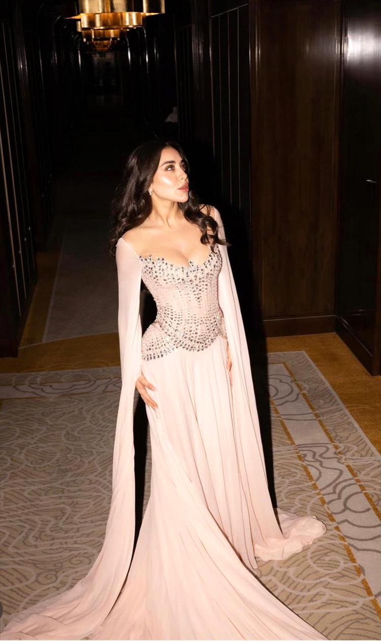 ظهرت هيا مرعشلي بإطلالة ساحرة من توقيع جورج حبيقة، بلون بيج يميل إلى الزهري. الجزء العلوي مطرز بدقة، مع أكمام طويلة منسدلة تضيف لمسة شاعرية، فيما تنسدل التنورة الطويلة الناعمة بذيل طويل، ليبرز مزيجًا مثاليًا بين النعومة والفخامة.