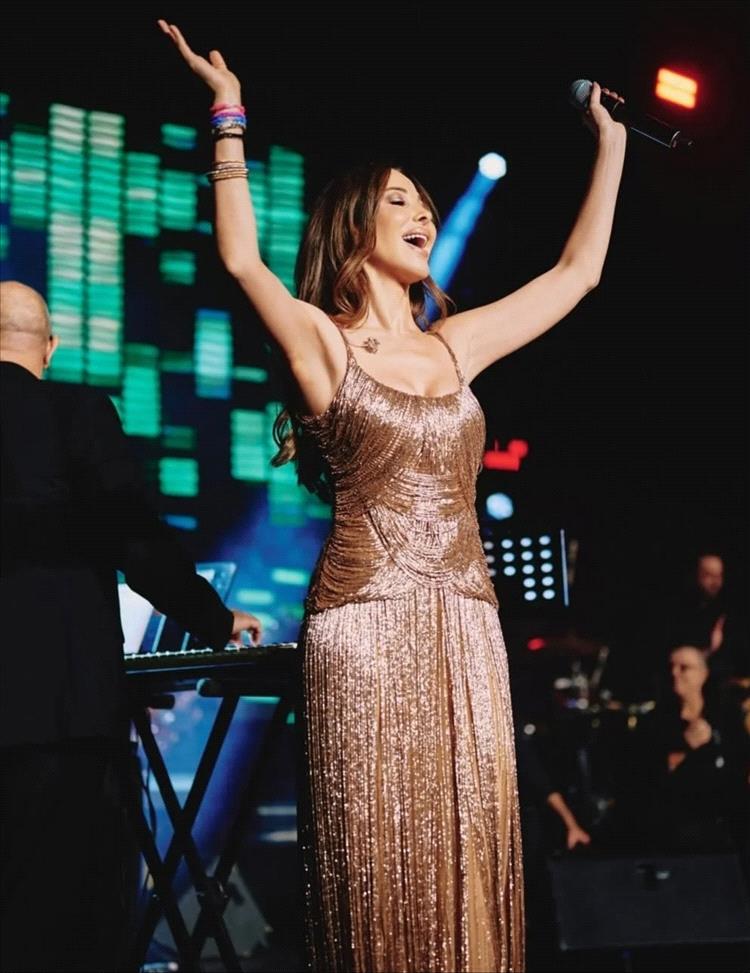 تألقت النجمة اللبنانية بفستان ذهبي من توقيع المصمم اللبناني- العالمي إيلي صعب، وتميّز بصيحة الشراريب الأنيقة والمناسبة للأجواء الاستعراضية، وجاء بحمّالات رفيعة مع فُتحة جريئة عند الصدر وبتصميم مجسم باللون البيج ومطرّز بالكامل بسلاسل من الخرز باللون الذهبي التي تم تصميمها بطريقة هندسية ناعمة عند البطن والورك، وينسدل من الأسفل بفُتحات واسعة عند الساقين على شكل تنورة من الشراريب الجذابة والبراقة.