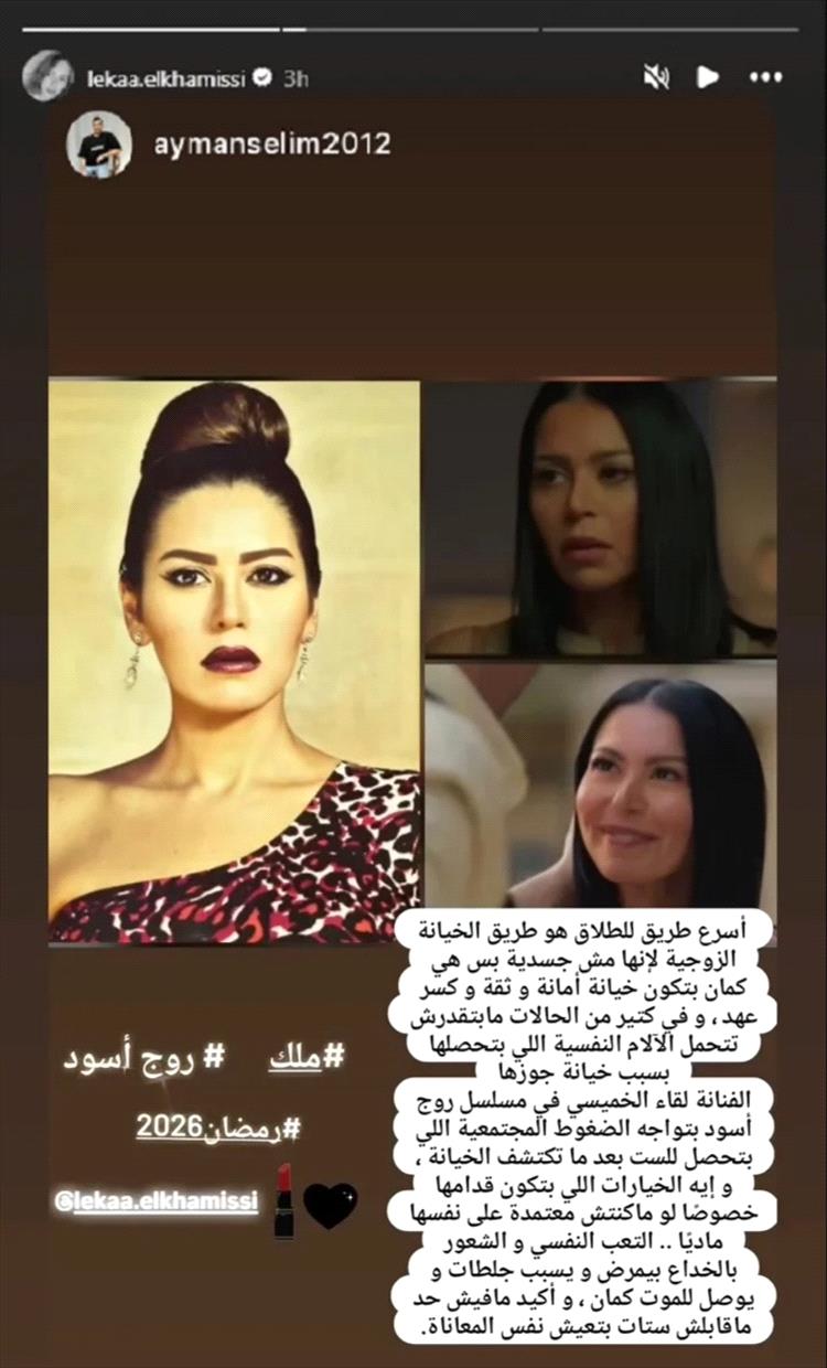 ونشرت لقاء عبر خاصية القصص المصوّرة الملحقة بحسابها الخاص في "إنستغرام" صوراً من شخصيتها في مسلسل "روج أسود" الذي تشارك به في دراما رمضان المقبل، وأرفقتها بالتعليق: "أسرع طريق للطلاق هو طريق الخيانة الزوجية لأنها مش جسدية بس هي كمان بتكون خيانة أمانة وثقة وكسر عهد، وفي كتير من الحالات ما بتقدرش تتحمل الآلام النفسية اللي بتحصلها بسبب خيانة جوزها".