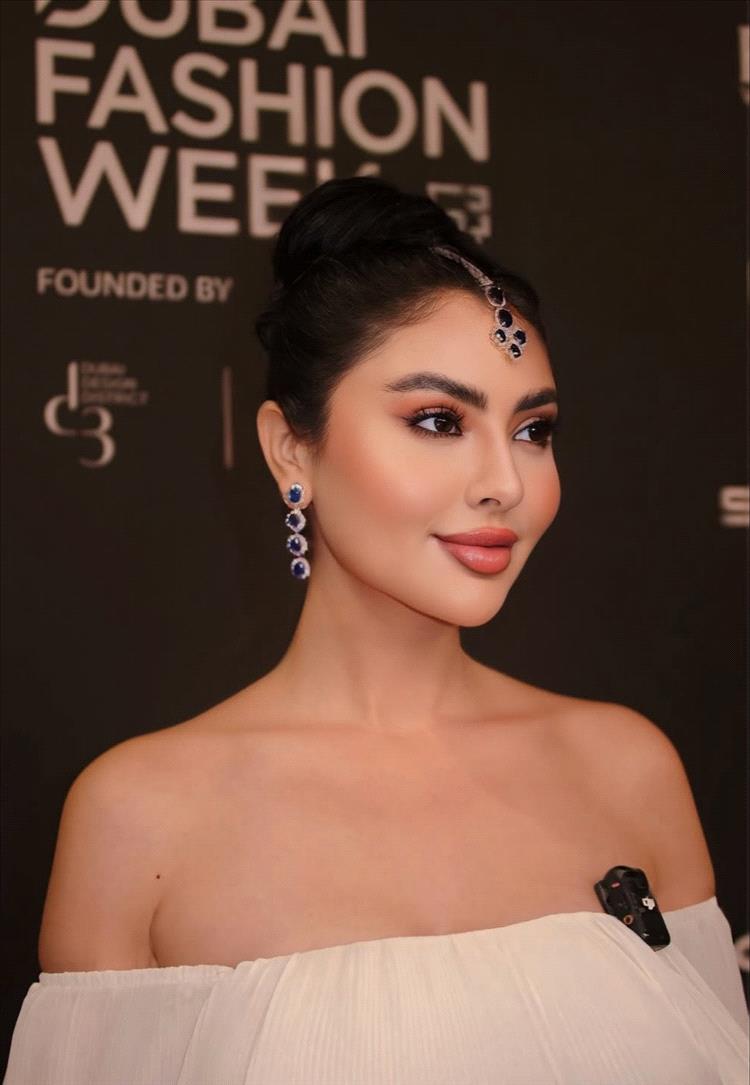 أكملت مريم حسين إطلالتها بأسلوب جمالي متقن، حيث اعتمدت تسريحة شعر مرفوعة مصففة بدقة، مع إكسسوار للشعر من الأحجار الكريمة باللون الأزرق مستوحى من الطابع الهندي، ما أضاف لمسة فخامة ملكية. أما مكياجها فجاء بلمسات برونزية بارزة مع بشرة موحّدة، مما عزز إشراقة وجهها ومنحها حضوراً متكاملاً وجاذبية أنثوية واضحة.