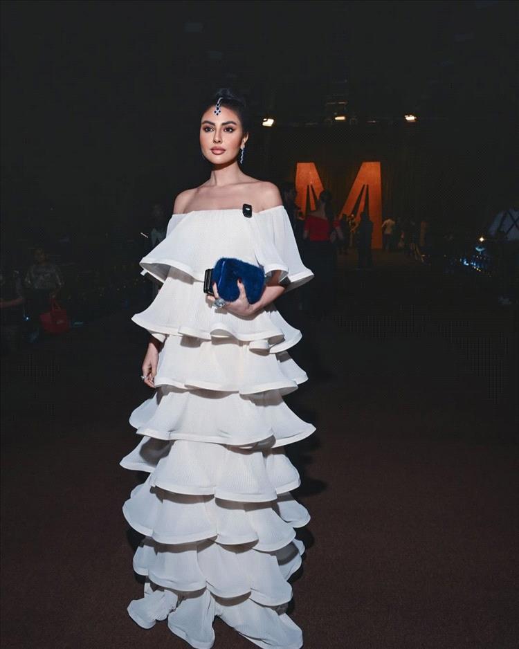 تألقت الفنانة مريم حسين بإطلالة جذابة وفخمة أثارت إعجاب الحضور، حيث اختارت فستاناً أبيض بطبقات من الكشاكش العريضة والمتدرجة من الأعلى إلى الأسفل بأسلوب فني راقٍ. هذا التصميم يتماشى مع الصيحة العالمية التي فرضت نفسها في عالم الموضة، ونجح في منح إطلالتها مزيجاً من الرقي والجرأة الأنثوية.