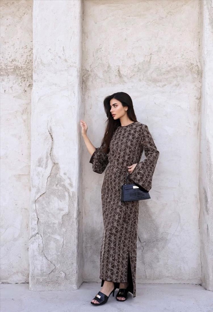 اختارت ديما الأسدي قفطاناً مستوحى من الفستان الضيّق من تصميم توري بورش،مع نقشة ناعمة وأنيقة وحقيبة سوداء متناسقة. هذه الإطلالة تجسّد المزج بين الطابع الشرقي والغربي بأسلوب عصري متوازن، مما يجعلها مثالية للسهرات الرمضانية والمناسبات الخاصة.