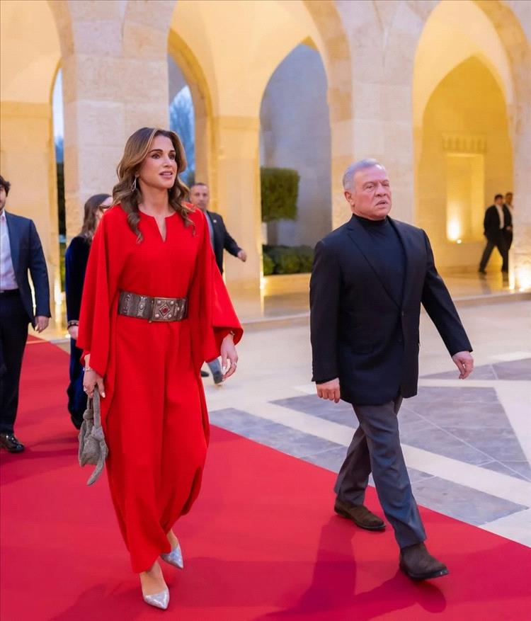 واختارت الملكة الأردنية فستاناً ناعماً باللون الأحمر بتصميم بسيط يخلو من النقوش والتطريزات، وجاء بقصة واسعة مع شق خفيف عند الرقبة وأكمام واسعة وفضفاضة، مستوحاة من تصميم العباءة، في إطلالة راقية وأنيقة تناسب الإفطار الملكي والأجواء الرمضانية الروحانية.
