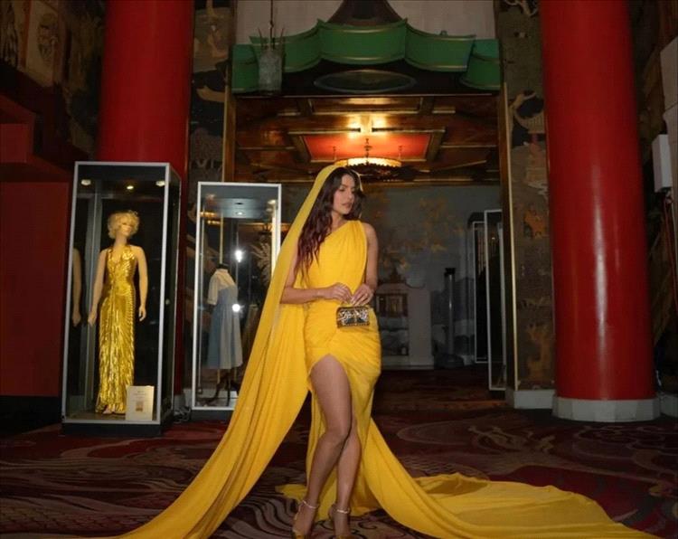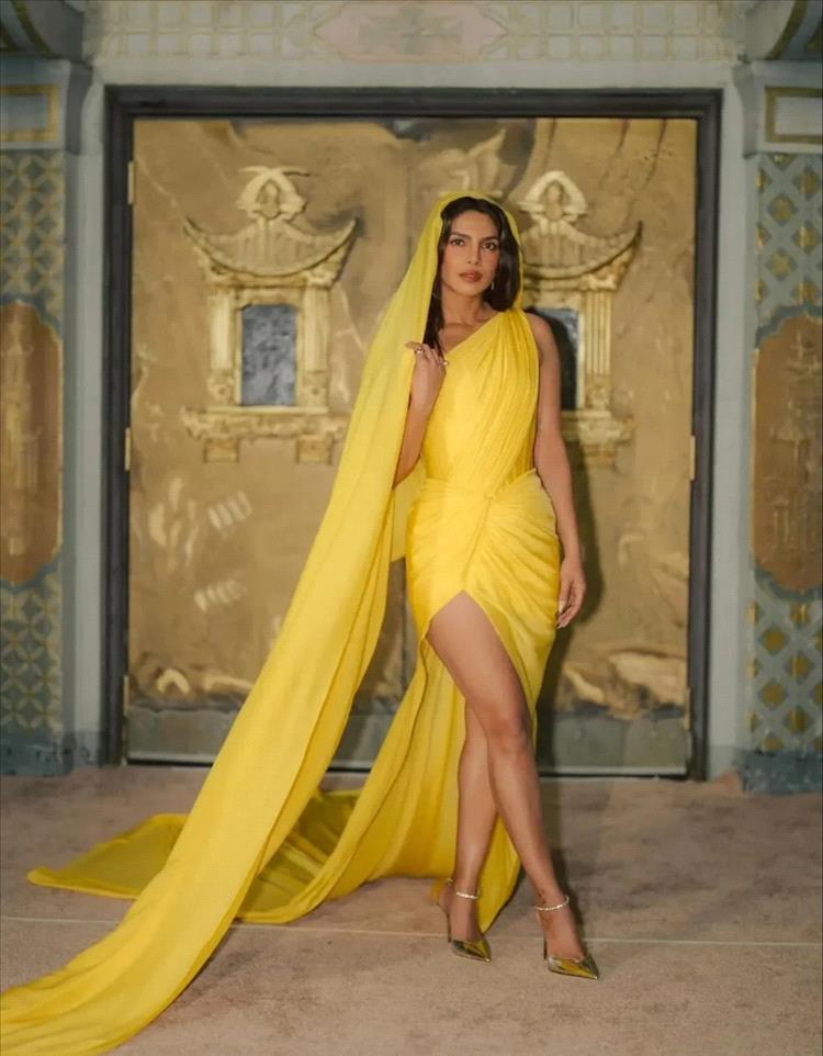 وفي أحدث إطلالة لها، في حفل ما بعد العرض الأول لفيلمها "ذا بلاف"، اختارت بريانكا تشوبرا جوناس فستان ساري باللون الأصفر الفاقع من مجموعة "ذا ديفاين أندروجين باريس كوتور" لربيع وصيف 2026 للمصمّم غاوراف غوبتا. يتميز الفستان بجزء علوي ضيق يشدّ القماش عند الخصر قبل أن ينسدل في ثنيات مكشكشة وفُتحة عالية. ومن إحدى الكتفين، يمتد شريط من الشيفون ليشكل طرحة طويلة، مما يضفي على الفستان لمسة جمالية مميزة.