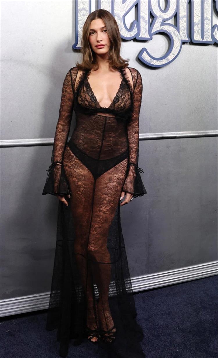 وصلت هايلي بيبر أيضاً إلى السجادة الحمراء، واختارت فستاناً أسود طويلاً من الدانتيل الشفّاف مع حذاء بكعب عالٍ مفتوح من الأمام.