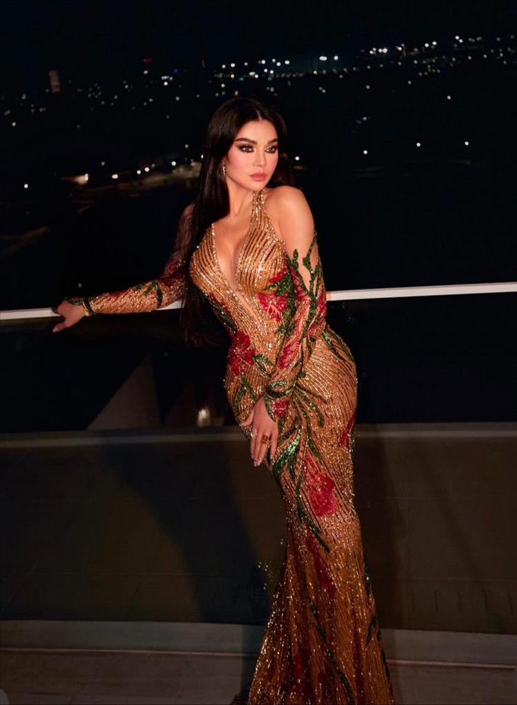 خطفت هيفاء وهبي الأنظار بفستان ذهبي مطرز بالورود، بياقة مفتوحة عند الصدر. الفستان جمع بين البريق الملكي والجاذبية المؤثرة، مع لمسة رومانسية من التطريز على طول التصميم، مما جعلها محور الانتباه في أي مناسبة.