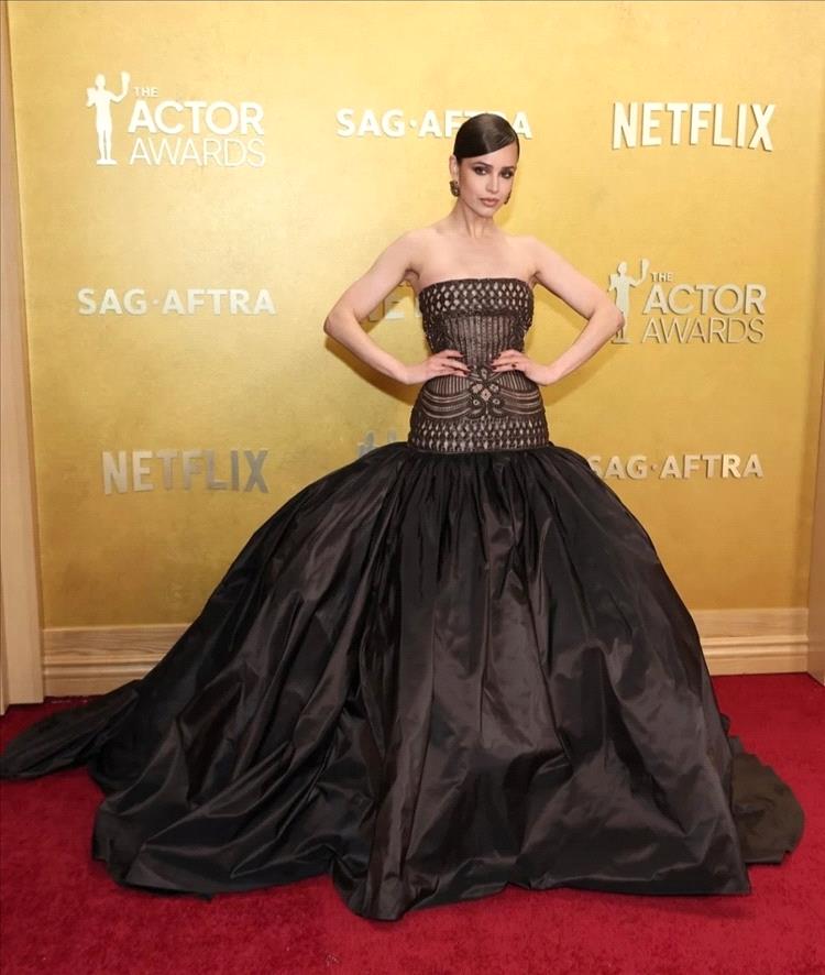 تألقت النجمة صوفيا كارسون بفستان طويل وأنيق، من مجموعة إيلي صعب الراقية لربيع وصيف 2026، جاء ضيقاً من الأعلى ومن دون أكمام بقماش مخرّم وينسدل من الأسفل بتنورة ضخمة بتصميم منفوش تصل الى حدود الأرض، وهو ما أضاف المزيد من الفخامة الى الإطلالة. وأكملت طلّتها بمجوهرات فاخرة من "شوبارد" Chopard.