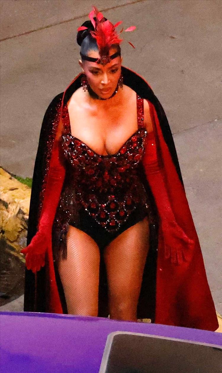 تبنّت كيم كارداشيان تماماً فكرة راقصات لاس فيغاس الاستعراضية، بزيٍّ لفت الأنظار على الفور. ارتدت نجمة تلفزيون الواقع وسيدة الأعمال زيّاً ضيقاً مُغطّى بتطريزاتٍ براقة تعكس الضوء من كل زاوية. تألقت بإطلالة ساحرة تميزت بتطريزات دقيقة وتفاصيل كريستالية حمراء أضفت عليها بريقاً مسرحياً أخاذاً.