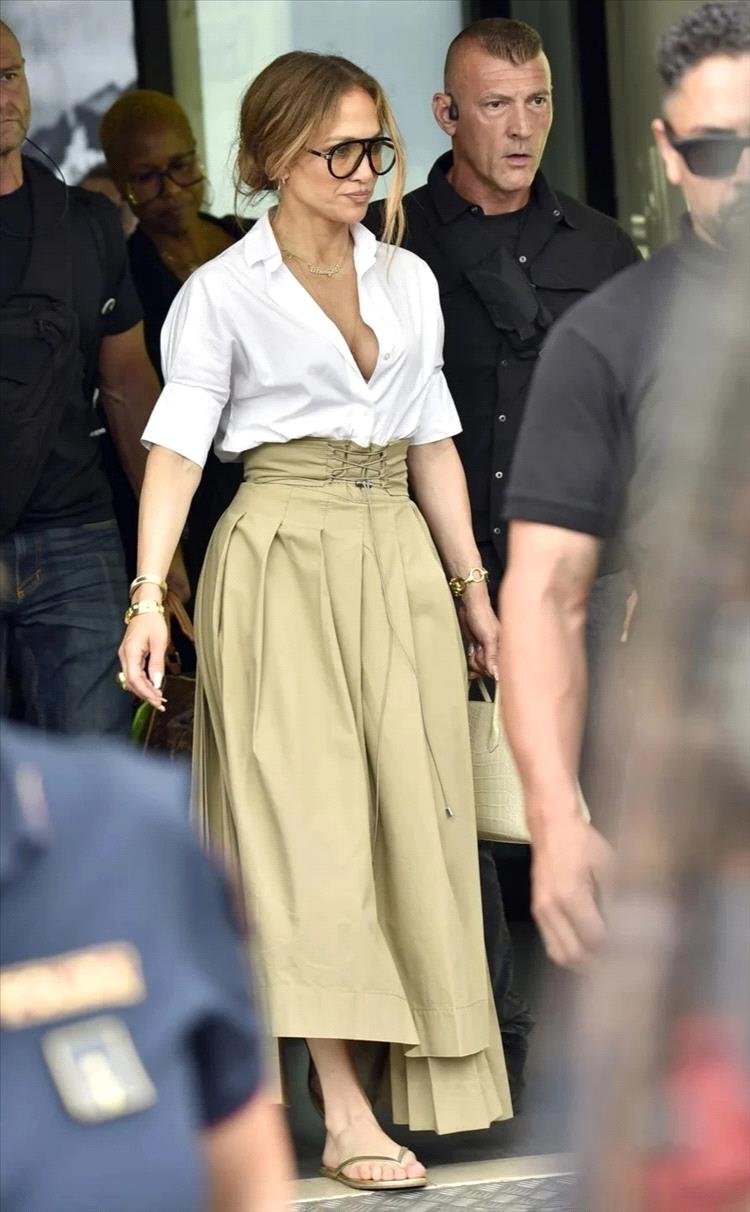 لم يكن من المستغرب رؤية جينيفر لوبيز ترتدي قميصاً أبيض اللون غير مزرّر، منسقاً مع تنورة طويلة باللون الكاكي، لدى وصولها إلى مطار لاس فيغاس، استعداداً لجولة غنائية جديدة فيها.