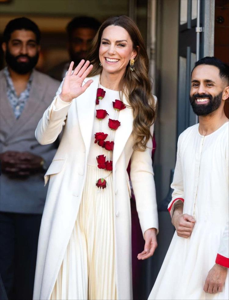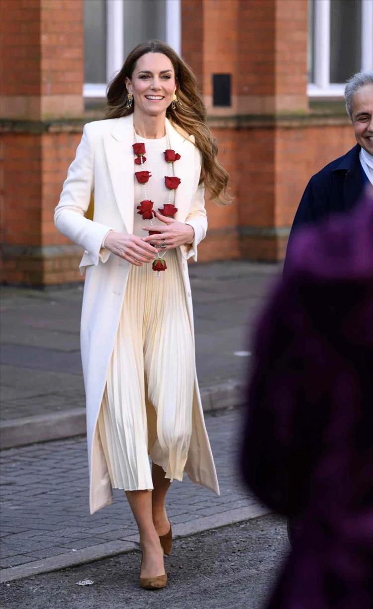 وبعد أيام على جعل الأمير ويليام يشعر بالخجل، خلعت أميرة ويلز حذاءها، وهو أمر غير معتاد خلال المناسبات الملكية. قبل خلعه، انتعلت الملكة المستقبلية حذاءً بكعب عالٍ بلون الجمل، مع معطفها الكريمي المصمّم خصيصاً لها من كريس كير، وارتدت فستاناً متوسط الطول من رالف لارين، وتزيّنت بأقراط متدلية - هدية عيد الميلاد من زوجها الأمير ويليام عام 2022 - وإكليل من اللؤلؤ والورود أُهدي إليها عند وصولها إلى مركز مجتمعي في ليستر يوم الخميس، والذي احتفل في وقت سابق من الأسبوع بعيد هولي، المهرجان الهندي للألوان والحب والربيع.