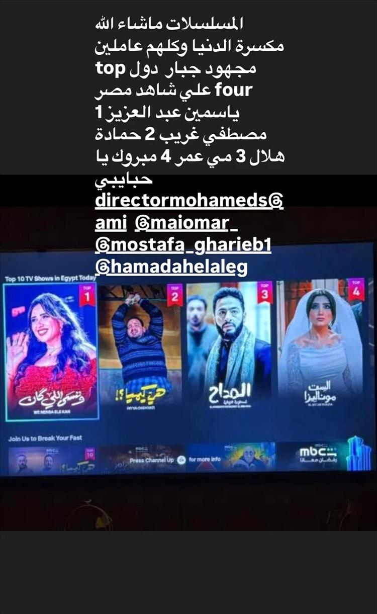 حيث كانت ياسمين، قد نشرت على خاصية القصص المصورة الملحقة على حسابها الخاص بـ"إنستغرام" صورة للأعمال التي تعرض على قناة mbc، كشفت من خلالها عن تصدر مسلسلها "وننسى اللي كان"، منصة MBC شاهد، وكتبت ياسمين معلقة على الصورة: "المسلسلات ما شاء الله مكسرة الدنيا وعاملين مجهود جبار.. ودول أول 4 مسلسلات على شاهد مصر، رقم 1 ياسمين عبد العزيز رقم 2 مصطفى غريب رقم 3 حمادة هلال رقم 4 مي عمر.. مبروك يا حبايبي".