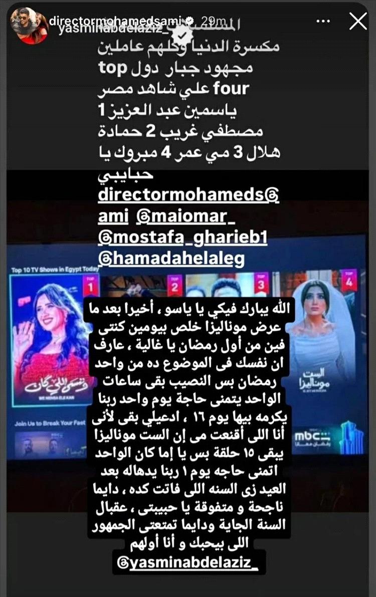 ورد محمد سامي، عبر حسابه الخاص على "فيسبوك" على منشور ياسمين قائلاً: "الله يبارك فيكي يا ياسو، أخيرًا بعد ما عرض موناليزا خلص بيومين، كنتي فين من أول رمضان يا غالية؟ عارف إن نفسك في الموضوع ده من واحد رمضان، بس النصيب بقى. ساعات الواحد يتمنى حاجة يوم واحد ربنا يكرمه بيها يوم 16".