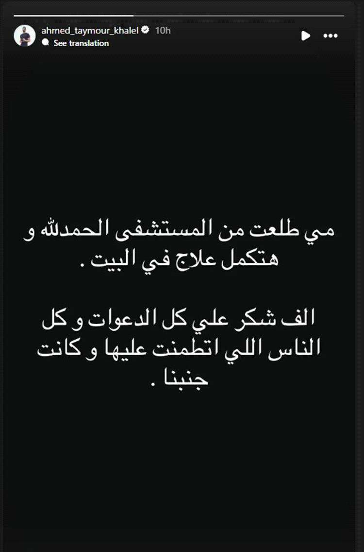وقال أحمد تيمور في منشوره: "مي طلعت من المستشفى الحمد لله وهتكمل علاج في البيت".