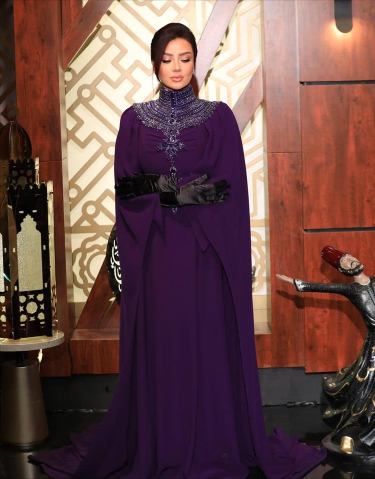 وتألقت الإعلامية المصرية بفستان فخم باللون البنفسجي الغامق، بتصميم محتشم وفضفاض مع أكمام واسعة في قصّة تشبه العباءة، وتميّز بحركة الشك المميزة التي غطت الرقبة بياقة عالية وامتدت الحبيبات المتلألئة بتدرجات اللون البنفسجي على منطقة الصدر والبطن في تصميم مبتكَر وعصري، أضاف المزيد من الفخامة الى الفستان.