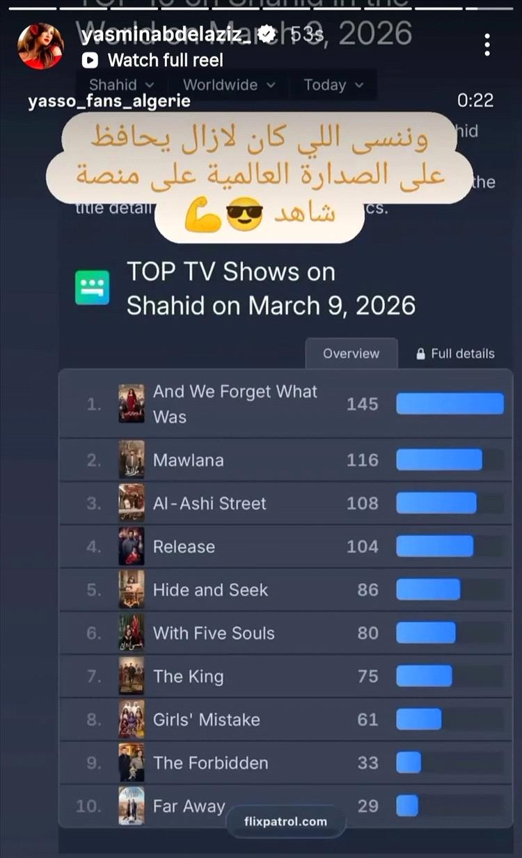وعلّقت ياسمين عبد العزيز على القائمة قائلةً: "(وننسى اللي كان) لازم يحافظ على الصدارة العالمية على منصة شاهد".