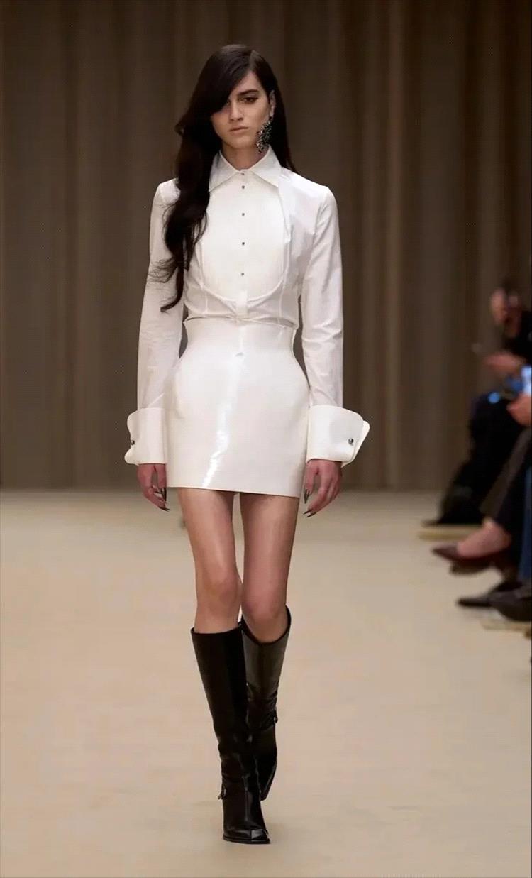 تُحوَّل الأقمشة الكلاسيكية بمعالجات ملمسية ولمعان مشوق: معاطف جلدية متغيرة اللون ولؤلؤية، بدلات من الحرير ميكادو مقطعة، وجاكارد مزهر مطوي.