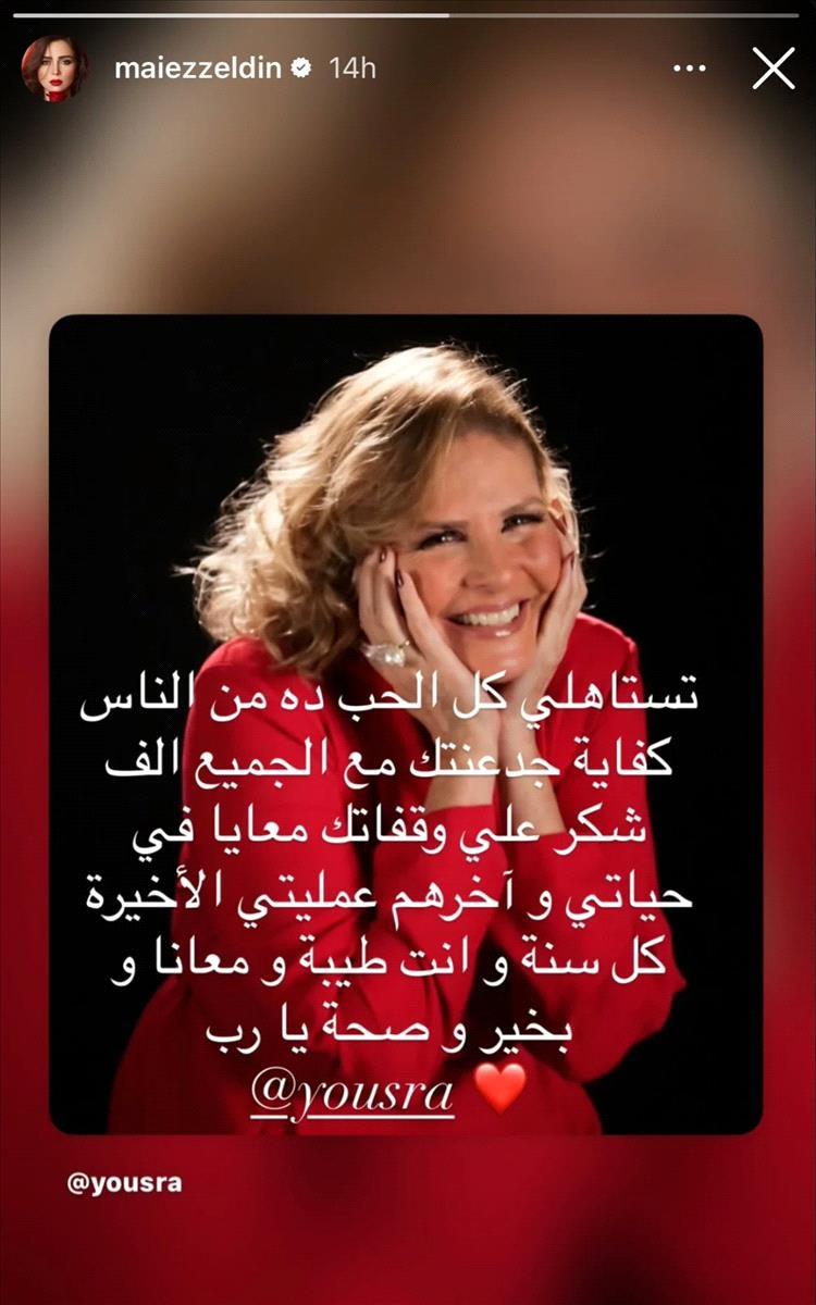 نشرت الفنانة مي عز الدين عبر خاصية القصص المصوّرة الملحقة بحسابها الخاص في "إنستغرام" صورة للفنانة يسرا هنّأتها من خلالها بمناسبة عيد ميلادها، كاشفةً عن موقف إنساني حصل خلال وعكتها الصحية الأخيرة، ومعبّرةً عن تقديرها لمواقفها معها.