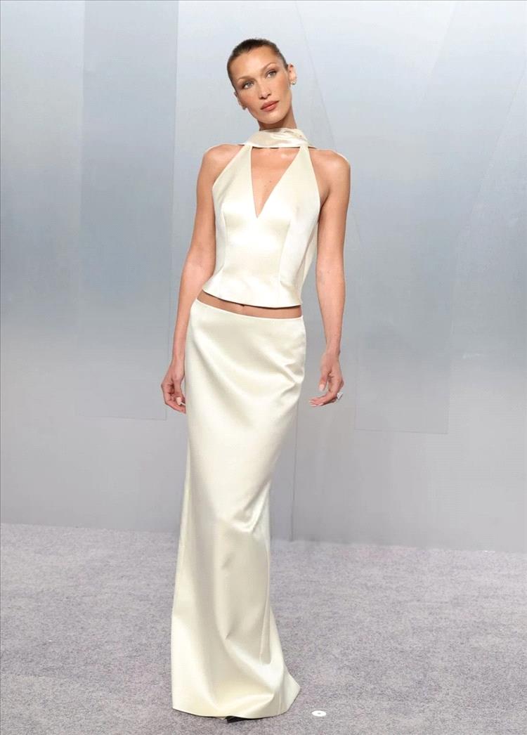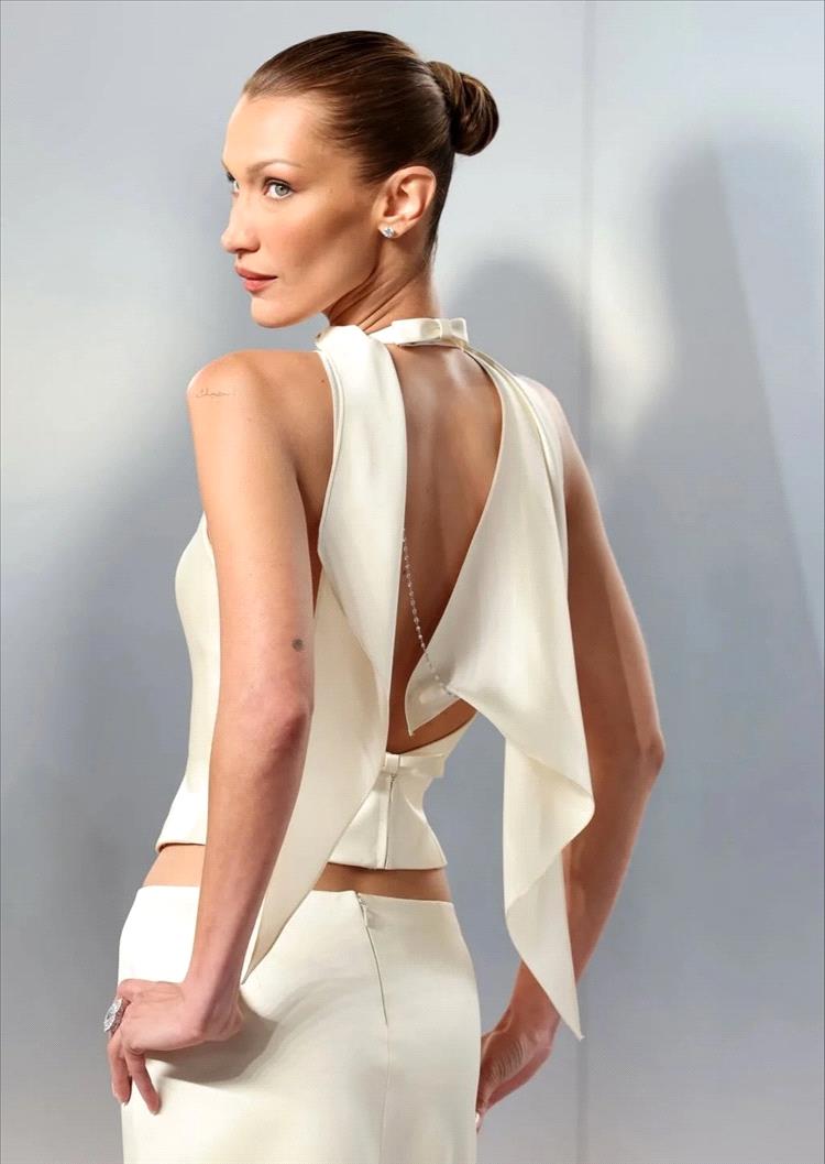 تألقت بيلا حديد بإطلالة لافتة في حفل "فانيتي فير" للأوسكار، حيث ارتدت توب كريمياً بياقة هالتر وتفاصيل وشاح مميزة، وتنورة ضيّقة من "برادا" Prada، كما تزيّنت بعقد وأقراط وخواتم من مجموعة "شوبارد" Chopard للمجوهرات الراقية.