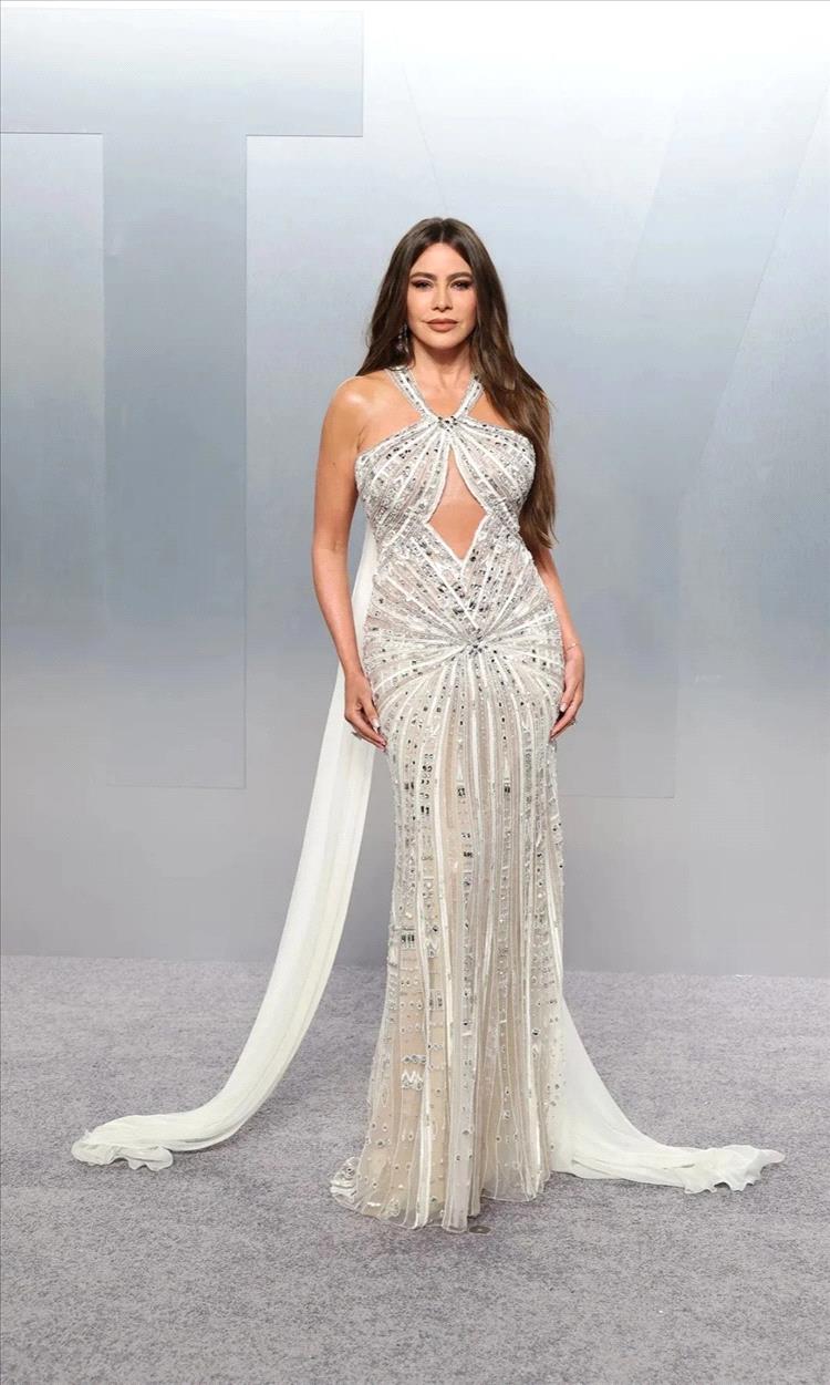 تألقت النجمة صوفيا فيرغارا Sof�a Vergara بفستان أبيض مُخصّص من زهير مراد Zuhair Murad، مزيّن بتفاصيل هندسية من الخرز المعقّد وتطريز فاخر. جاء التصميم مع حمّالات متقاطعة وفُتحة أمامية على شكل Keyhole، بالإضافة إلى عباءة متصلة بالفستان أضفت لمسة ملكية راقية. هذه الإطلالة جمعت بين الحداثة والكلاسيكية في آن واحد، مع إبراز شكل القوام بأسلوب أنثوي راقٍ، ما جعل صوفيا تتصدّر قائمة أجمل الإطلالات في الحفل.