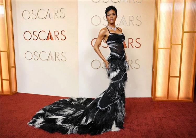 تميّز فستانها العصري بجزء علوي شفّاف مزيّن بتفاصيل فضّية لامعة مجرّدة، وتنورة مزيّنة بريش أبيض وأسود، تنسدل في ذيل طويل دراماتيكي خلفها.