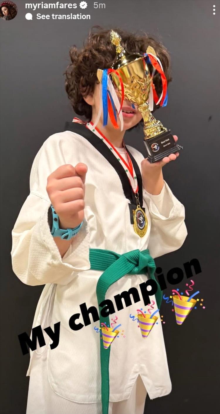 وعبّرت النجمة اللبنانية عن فخرها بفوز ابنها بالكأس الذهبي، ووصفته بـ"بطلي"، للتعبير عن سعادتها بإنجاز ابنها الرياضي وبقدرته على الالتزام بالتدريب.