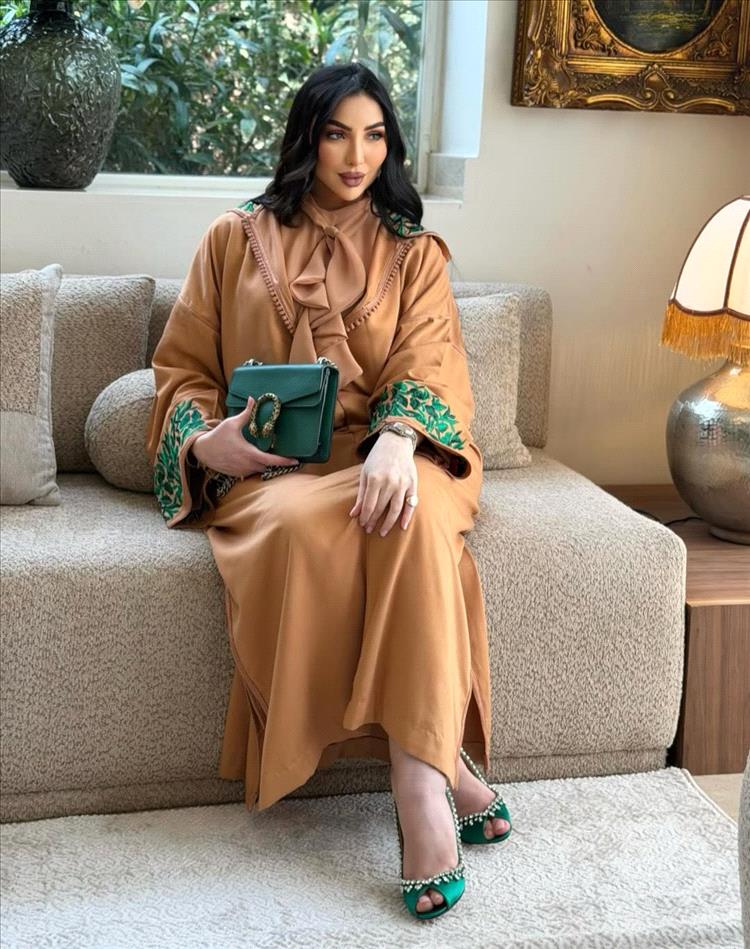 أما التفاصيل الفنية، فبرزت من خلال التطريزات باللون الأخضر عند حواف الأكمام، والتي منحت الإطلالة حيوية وأناقة خاصة. ونسّقت مع القفطان حقيبة جلدية باللون الأخضر من علامة Bvlgari، إلى جانب حذاء بأسلوب Peep Toe باللون نفسه، ما خلق تناغمًا لونيًا أنيقًا يعكس ذوقًا رفيعًا في اختيار التفاصيل.