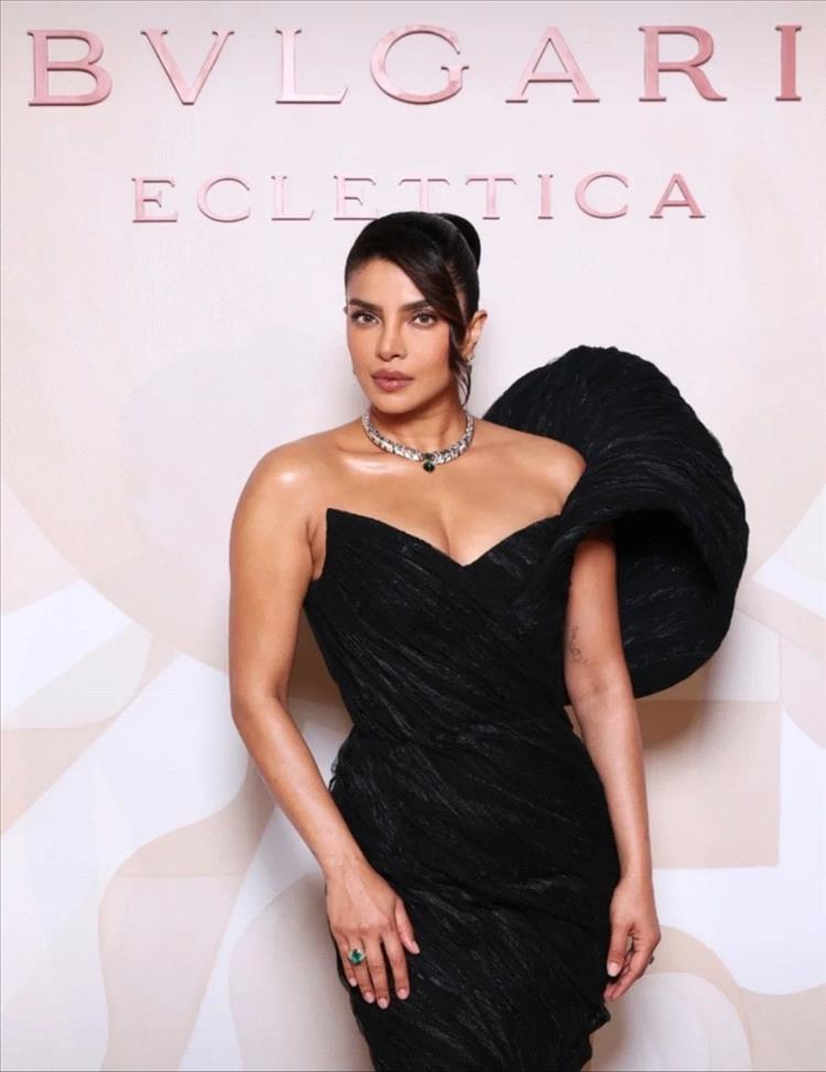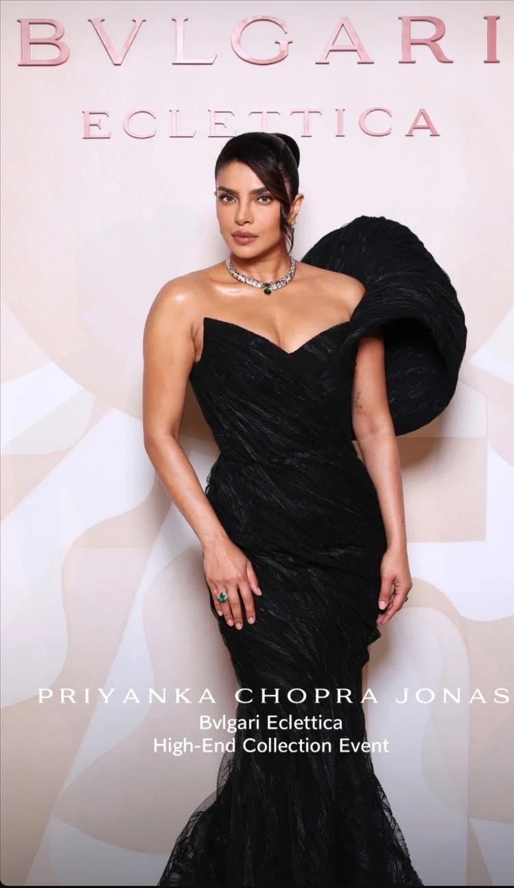 وحضرت نجمة بوليوود فعالية Bulgari إكليتيكا للمجوهرات الراقية، بكامل أناقتها واختارت فستاناً أنيقاً باللون الأسود بتصميم ضيّق يلتفّ بدقة حول قوامها الممشوق وكأنه مصمّم خصيصاً لها. تميّز الفستان بياقة على شكل قلب حادة ومنظمة، تنساب بسلاسة إلى تفاصيل معمارية رائعة على إحدى الكتفين، مما منح الإطلالة لمسةً من الرقي. أما قماش الفستان نفسه فيتميز بملمس غنيّ مذهل يعكس الضوء مع كل حركة، وينتهي بذيل انسيابي خلفها، مضيفاً لمسةً أنيقة من سحر نجمات السينما الكلاسيكية.