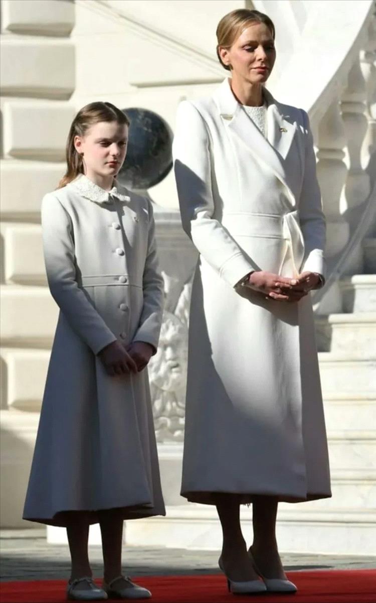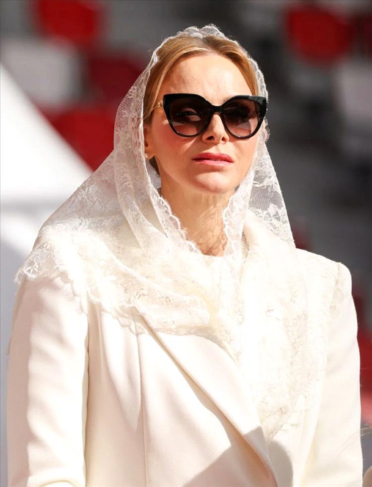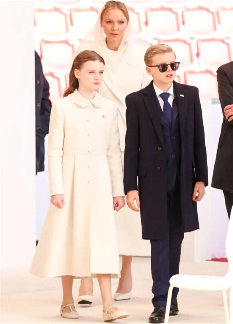 ولتعزيز المظهر الملكي الهادئ الذي يميز اطلالات الأميرة في كل المناسبات، تزينت ببروش ذهبي صغير على طية صدر السترة، وله دلالة عميقة بإظهار علمي موناكو والفاتيكان، وهو إشارة مثالية إلى الأناقة الدبلوماسية. وارتدت تحت المعطف فستاناً أبيض بتصميم بسيط متوسط الطول بأكمام طويلة وتفاصيل دانتيل رقيقة، وعطت شعرها بشال مخرم من الدانتيل باللون الأبيض.