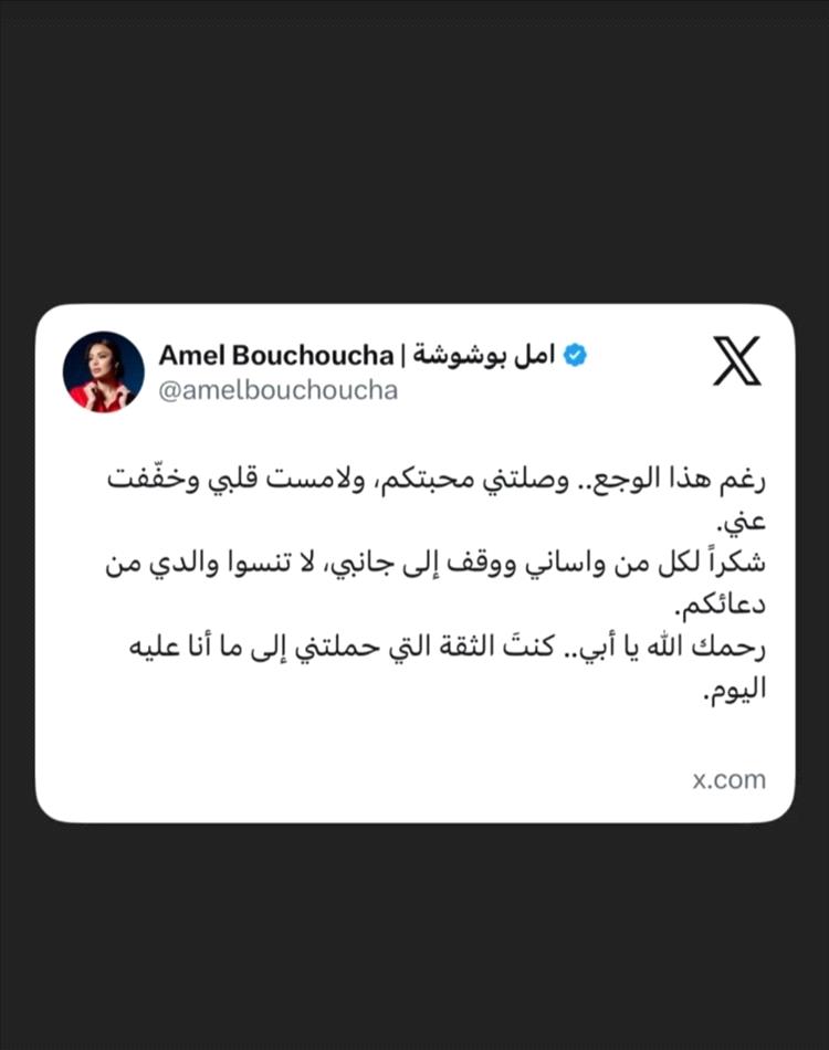 وحرصت الفنانة الجزائرية على توجيه رسالة الى كل مَن ساندها وواساها في مصابها الأليم عبر حسابها الخاص منصّتَي "إكس" و"انستغرام"، وكتبت في تدوينتها: "رغم هذا الوجع... وصلتني محبتكم، ولامست قلبي وخفّفت عني. شكراً لكل مَن واساني ووقف بجانبي، لا تنسوا والدي من دعائكم".