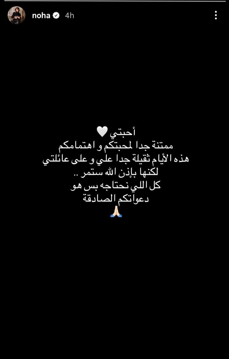 وفي التفاصيل، كتبت نهى نبيل: "ممتنة جداً لمحبتكم واهتمامكم… هذه الأيام ثقيلة جداً عليّ وعلى عائلتي، لكنها بإذن الله ستمر… كل ما نحتاجه هو دعواتكم الصادقة"، في كلمات حملت طابعاً إنسانياً مؤثراً، بعيداً عن أي تأكيد أو نفي صريح لما يتم تداوله.