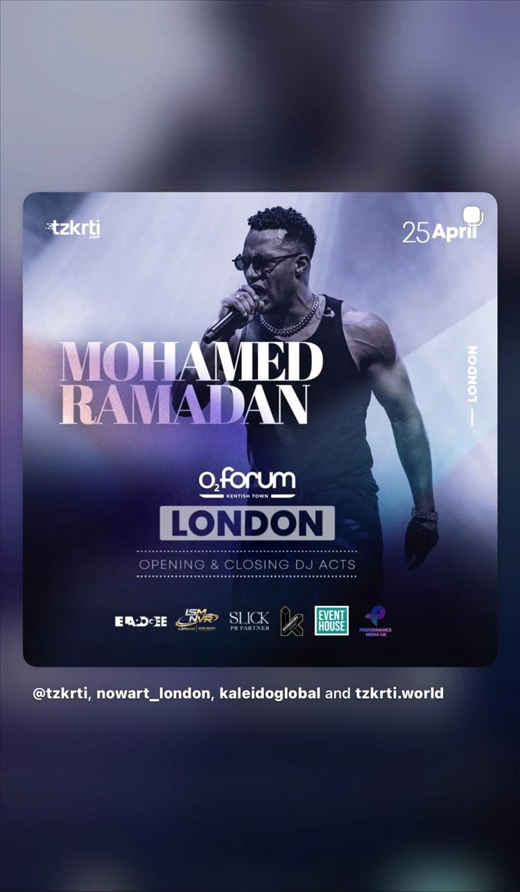 نشر الفنان محمد رمضان، عبر خاصية القصص المصورة الملحقة على حسابه الخاص بـ"إنستغرام" بوستر حفله الغنائي المرتقب والمقرر أن يحييه في العاصمة البريطانية لندن، يوم 25 نيسان (أبريل) الجاري، ضمن سلسلة حفلات أعياد الربيع التي تنظمها الشركة المنظمة للحفل.