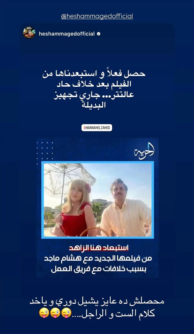 علّق الفنان هشام ماجد على الأخبار التي انتشرت عبر وسائل التواصل الاجتماعي وبعض المواقع الإخبارية حول استبعاد الفنانة هنا الزاهد من فيلمه الجديد "ملك الغابة"؛ حيث نشر عبر خاصية القصص المصوّرة الملحقة بحسابه الخاص في "إنستغرام" صورة من الخبر وعلّق عليه قائلاً: "حصل فعلاً أن استبعدناها من الفيلم بعد خلاف حاد على التتر... وجارٍ تجهيز البديلة".