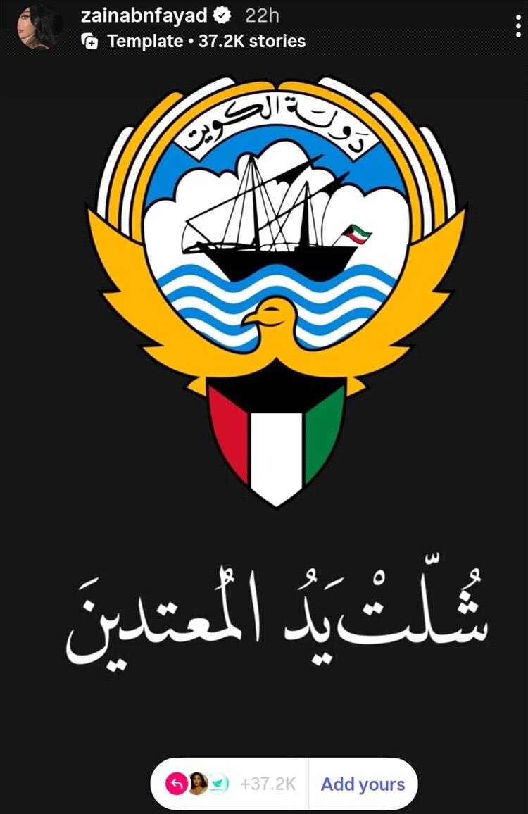 وشاركت الفاشينيستا اللبنانية متابعيها عبر خاصية الستوريز في "إنستغرام" بمنشور كتب فيه: "شُلّت يد المعتدين على دولة الكويت"، وأرفقته بشعار الدولة الذي يتمثل بصقر ذهبي باسط جناحيه ويحتضن سفينة شراعيه تطفو على أمواج زرقاء وبيضاء، مع عَلَم الكويت في المنتصف، في إشارة إلى التراث البحري والبرّي للكويت.