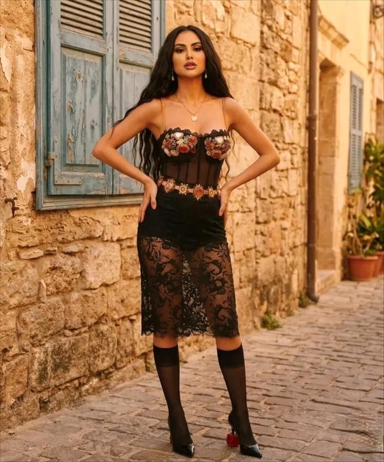وأكملت مريم حسين الإطلالة بتنورة قصيرة تلتصق بها تنورة من الدانتيل الأسود تصل الى حدود الركبة، وتميزت بحركة الفُتحة الناعمة من الخلف. ونسّقت التنورة بجوارب شفّافة طويلة مع حذاء نسائي باللون الأسود ذي كعب عالٍ تزيّن أسفله قطعة كبيرة باللون الأحمر، وهو ما أضاف لمسة من الفخامة الى طلّتها.