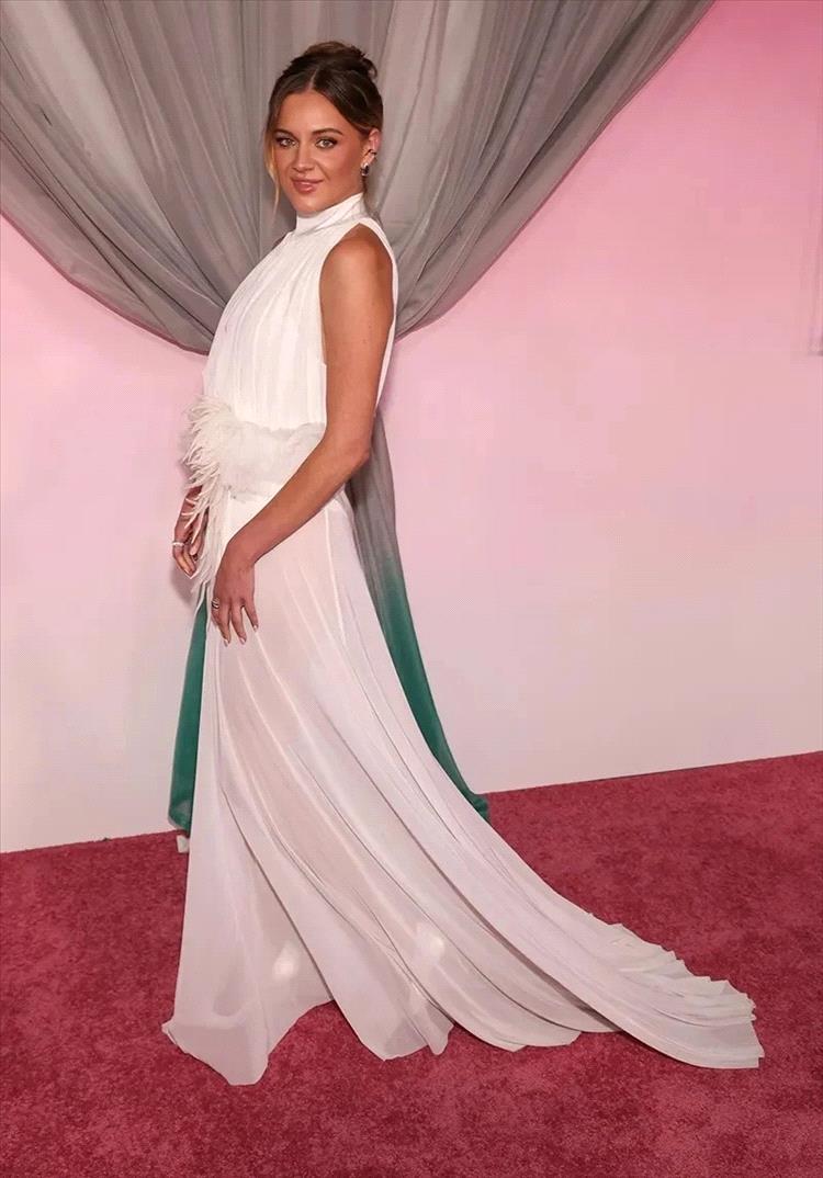 باليريني، التي انتقلت أخيراً إلى مدينة نيويورك، سافرت من الساحل الشرقي إلى الساحل الغربي لحضور الحفل المليء بالنجوم في استوديوهات نيا. أضفت نجمة موسيقى الريف لمسة زفاف مفاجئة على إطلالات السجادة الحمراء بفستان مذهل بياقة عالية من مجموعة ديفيد كوما لربيع وصيف 2026 للأزياء الجاهزة. تميز تصميم فستان باليريني بياقة عالية بدون أكمام وقماش شيفون مطوي يغطي الجزء الأمامي والخلفي من الصدر الفضفاض.