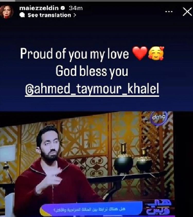 نشرت الفنانة مي عز الدين، عبر خاصية القصص المصوّرة الملحقة بحسابها الخاص في "إنستغرام"، صورة لزوجها مدرّب اللياقة البدنية أحمد تيمور خلال ظهوره ضيفاً في برنامج "هي وبس" مع الإعلامية رضوى الشربيني.