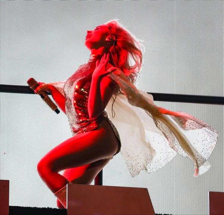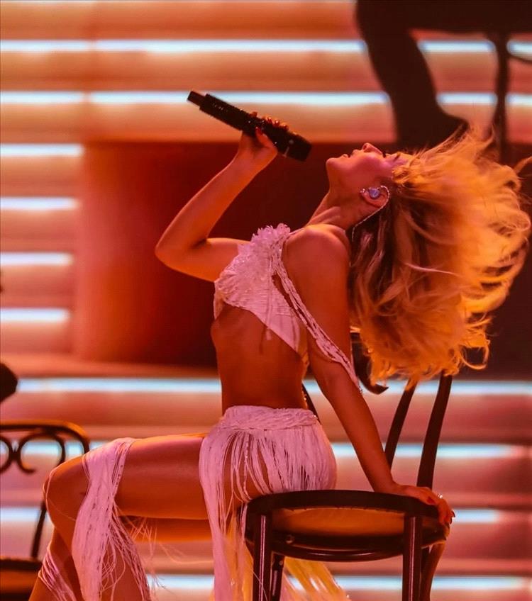وتألقت بعدها على المسرح، واستبدلت فستانها القصير البراق، بإطلالة بيضاء تشبه بدلات الرقص الشرقي لناحية التصميم، وجاءت من قطعتين، صدرية بربطة ملتفة حزل الرقبة وبسلاسل براقة تتدلى منها وتكشف عن جسمها، والقطعة الثانية عبارة عن تنورة مصنوعة من الشراريب مع حزام مزخرف بالحبيبات البراقة عند الورك، في اطلالة جريئة ومختلفة.