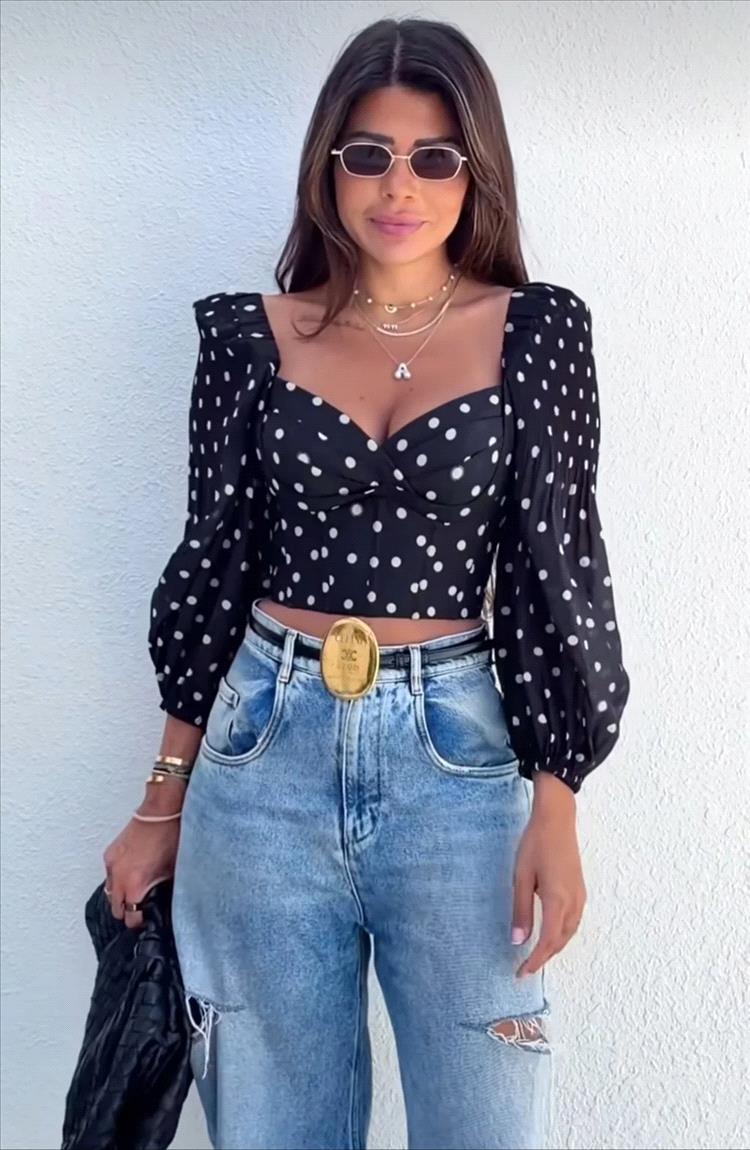 أما في إطلالتها الأخيرة، فاختارت توب كروب بنقشة البوكا دوتس مع أكمام ريترو واسعة، ونسقته مع الجينز الأزرق. هذا اللوك يعكس عودة صيحات الريترو بقوة، لكن بأسلوب حديث يناسب المرأة العصرية.