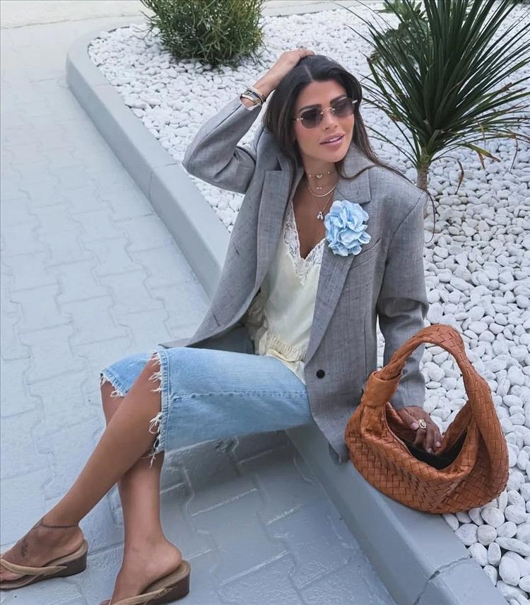 اعتمدت قميصًا من الدانتيل الأبيض مع جينز بقصة البرمودا، في مزيج يجمع بين الرقي والراحة. الدانتيل أضفى لمسة ناعمة وراقية، بينما أضاف الجينز القصير طابعًا صيفيًا عمليًا يناسب الإطلالات اليومية.