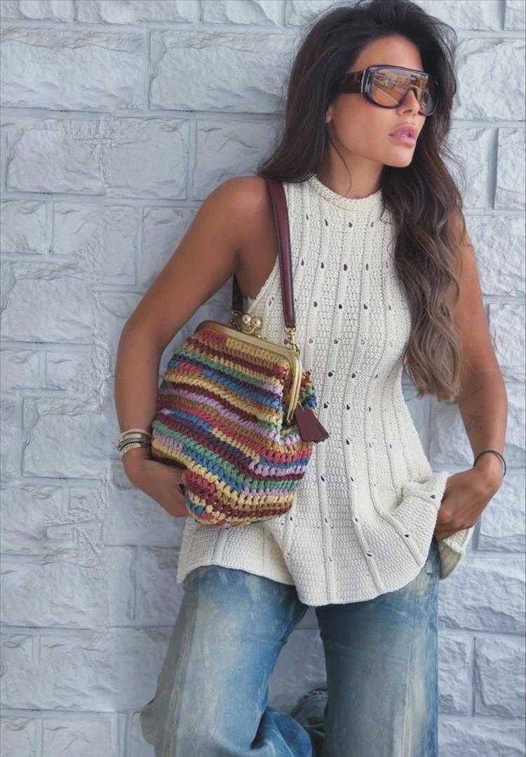 في إطلالة أخرى، تألقت بتوب كروشيه طويلة باللون الأبيض بقصة A Line، نسقتها مع الجينز وحقيبة كروشيه ملونة. هذا التنسيق يجمع بين الحرفية التقليدية والستايل العصري، ليمنحها حضورًا لافتًا يعكس اهتمامها بالتفاصيل الفريدة.