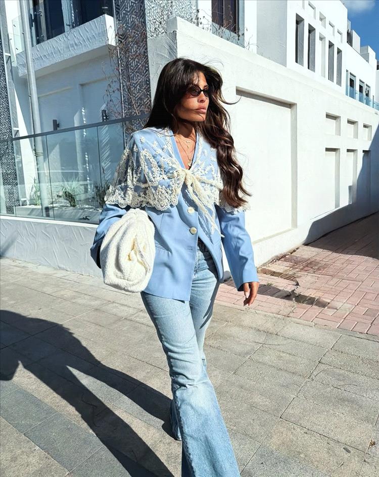في تنسيق آخر، اختارت قميصًا أزرق طويلًا مزينًا بتفاصيل دانتيل بيضاء، مع جينز أزرق. هذا الدمج بين اللونين الكلاسيكيين والتفاصيل الأنثوية خلق إطلالة متوازنة تجمع بين الجرأة والبساطة.