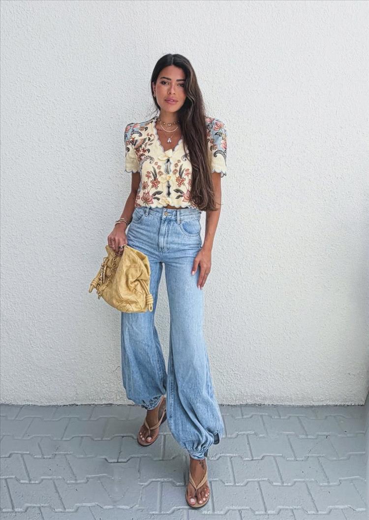 اختارت العنود قميصًا بيج قصيرًا مزينًا بنقشات الورود، ونسقته مع جينز أزرق كلاسيكي. هذا اللوك يعكس روح الصيف الخفيفة، حيث تضيف الطبعات الزهرية لمسة رومانسية، بينما يحافظ الجينز على الطابع العملي والعفوي للإطلالة.