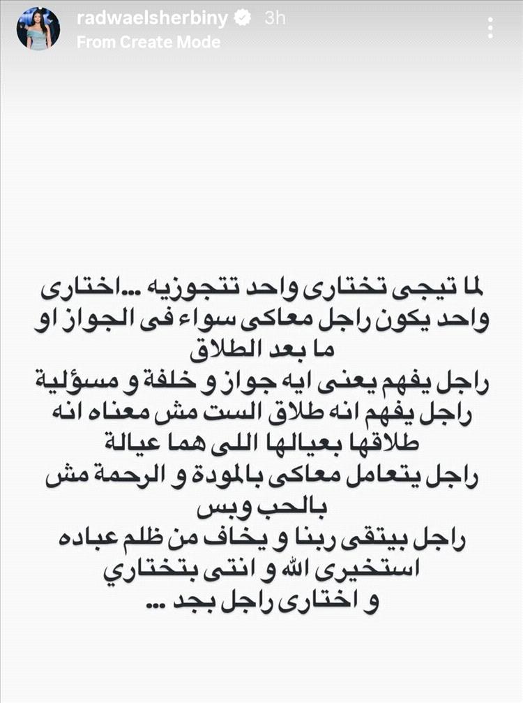 وقدّمت الإعلامية المصرية في منشورها رسالة الى الصبايا قالت فيها: "لما تيجي تختاري واحد تتجوزيه، اختاري واحد يكون راجل معاكي سواء في الجواز أو ما بعد الطلاق، راجل يفهم يعني إيه زواج وخلفة وأولاد ومسؤولية".