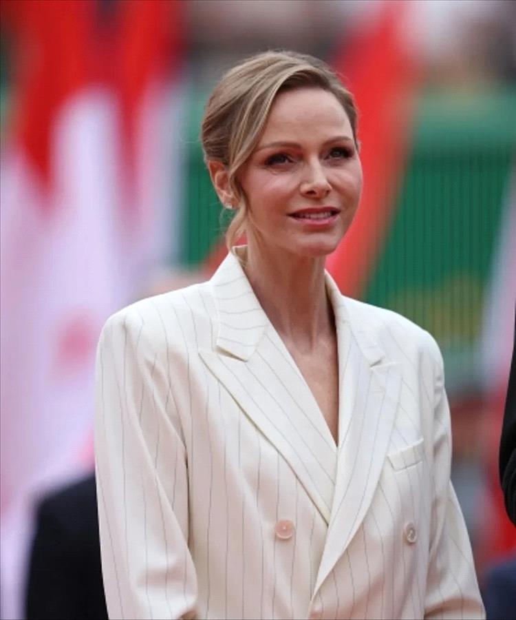 ومن الناحية الجمالية، رفعت الأميرة شارلين شعرها الأشقر بتسريحة "كعكة" عالية مع غرة جانبية من الأمام بحركة "ويفي" ناعمة، وطبّقت مكياجاً هادئاً بألوان ترابية دافئة لظلال العيون مع أحمر شفاه باللون الأحمر الفاقع، الذي يضيف لمسة من الأنوثة والحيوية والجاذبية الى طلّتها النهائية.