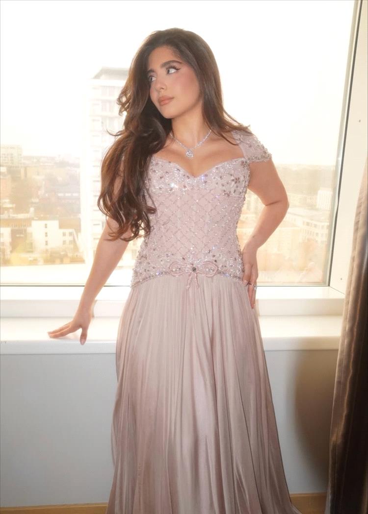 واختارت النجمة المصرية فستاناً طويلاً باللون الوردي الناعم من تصميم إيلين صباغ، من مجموعة الأزياء الجاهزة لخريف وشتاء 2026، ويصل سعره إلى 8500 دولار. وتميز بأسلوبه الانيق بقصّة ضيقة من الأعلى وفتحة جريئة بشكل قلب عند منطقة الصدر وتزين القماش بشبكة أنيقة مزينة بالترتر الوردي والأحجار اللامعة، مع حزام متلألئ عند الورك يتوسطه فيونكة ناعمة.