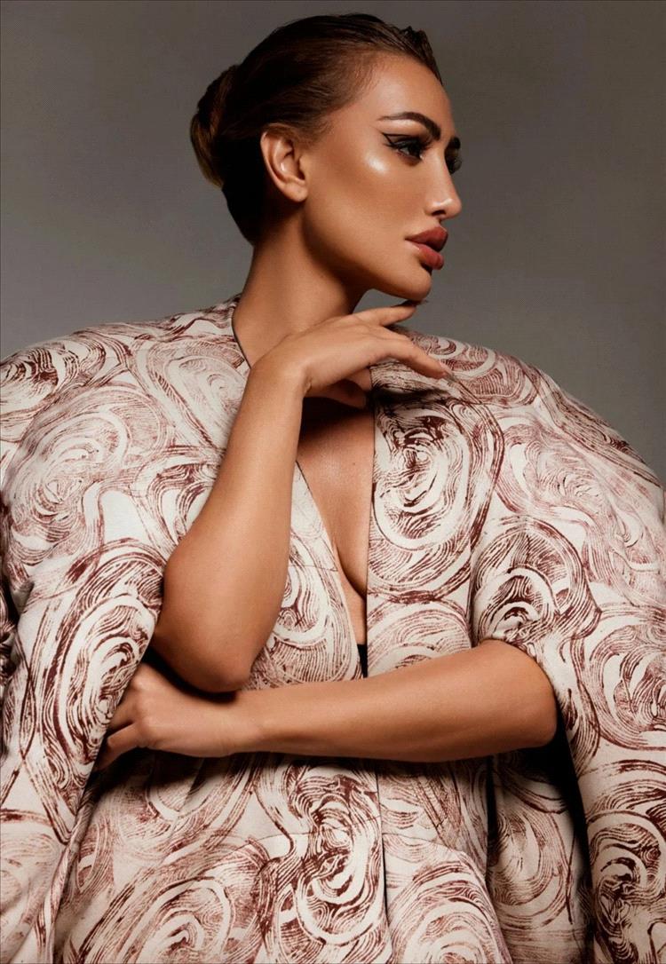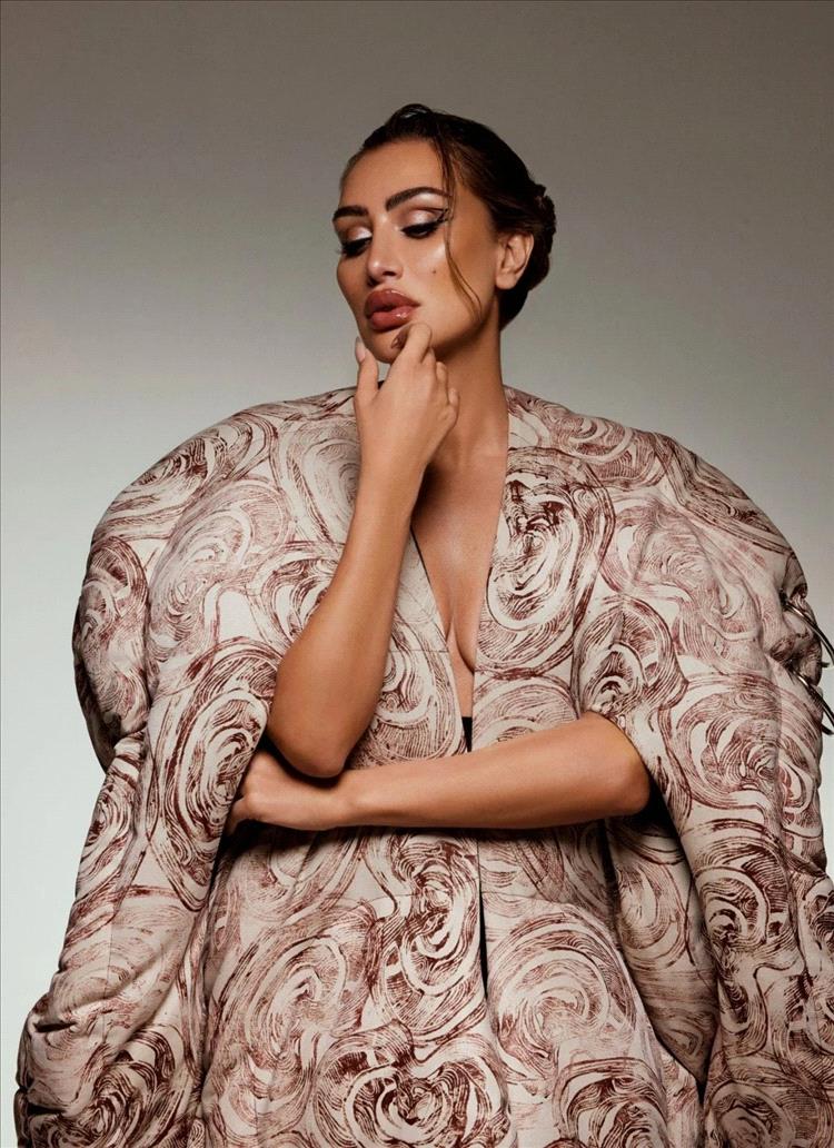 القماش جاء بنقشة تجريدية بدرجات البيج والبنّي، ما أضفى عمقاً بصرياً على التصميم، وجعل الإطلالة تبدو كلوحة متحركة. هذا النوع من الأزياء لا يهدف فقط إلى إبراز الجمال، بل إلى خلق حالة فنية متكاملة.