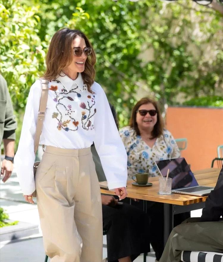 ظهرت الملكة بإطلالة تجمع بين الكلاسيكية العصرية والعملية، حيث اختارت قميصاً أبيض أنيقاً مزيّناً بتطريزات دقيقة بطابع نباتي، يُرجّح أن يكون من دار "ديور" Dior، وهو خيار يعكس ذوقها المعروف في انتقاء القطع الراقية ذات اللمسة الحِرفية. ونسّقت جلالتها القميص مع سروال عالي الخصر باللون البيج بقصة مستقيمة من توقيع "ماكس مارا" Max Mara، ما أضفى على الإطلالة طابعاً عملياً يناسب طبيعة الزيارة الميدانية.